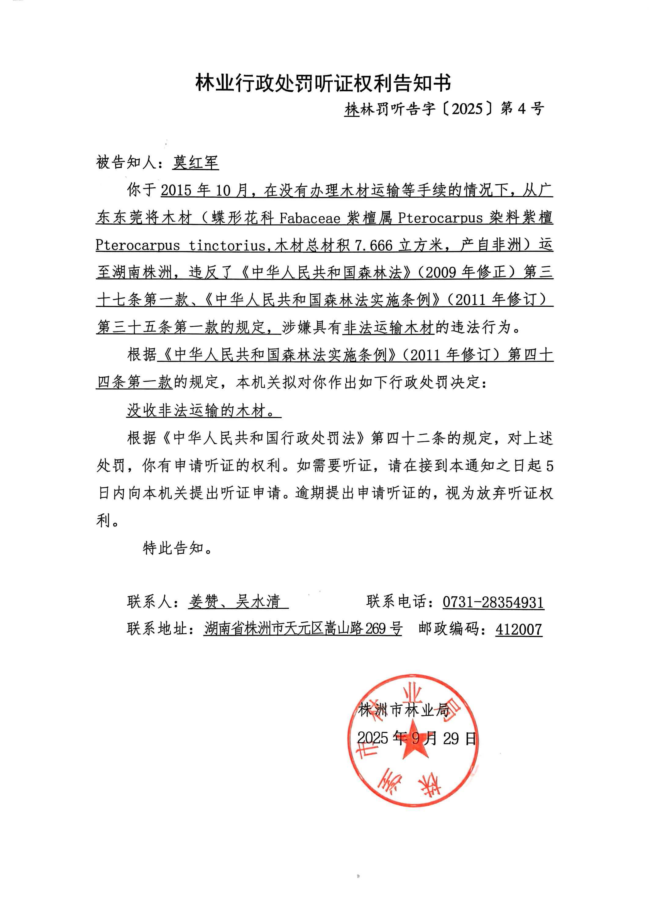 林业行政处罚听证权利告知书、株林罚听告字〔2025〕第4号